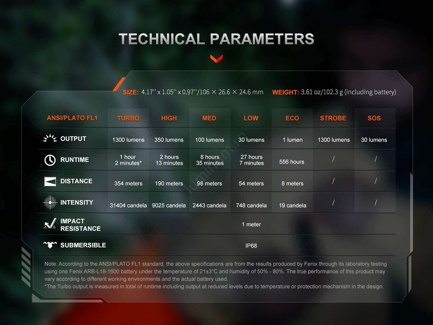 • Șapte moduri de iluminare: Turbo 1300 lumeni (1 h 2 min) – 350 lumeni (2 h 13 min) – 100 lumeni (8 h 35 min) – 30 lumeni (27 h 7 min) - 1 lumen (556 ore) – Stroboscop (1300 lumeni) – SOS (30 lumeni).