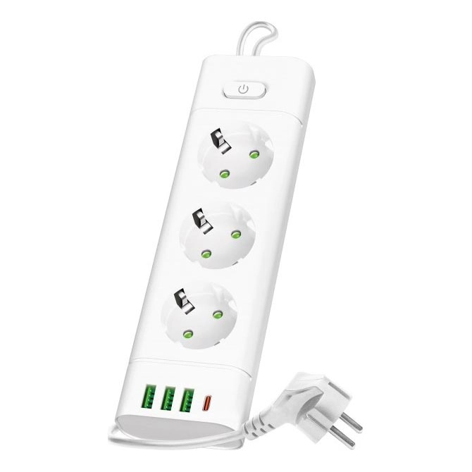 Multipriză LINEA PRO cu întrerupător, 3x230V + 3xUSB-A + 1xUSB-C, prize SCHUKO, cablu 3 m, albă