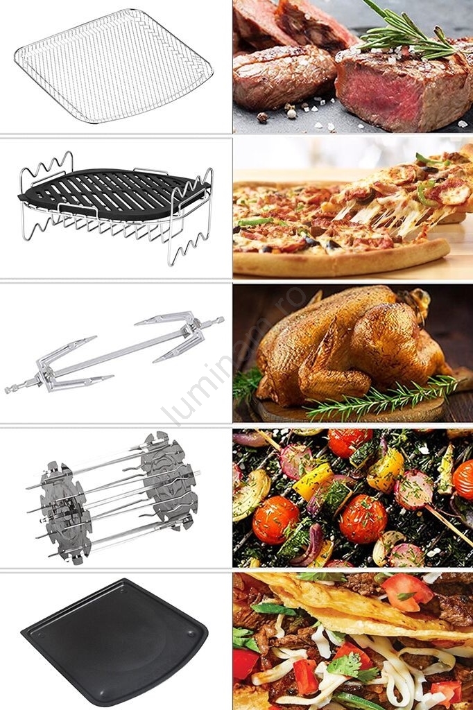 • Echipament multifuncțional: friteuză cu aer cald, rotisor, cuptor, uscător de fructe și multe altele.