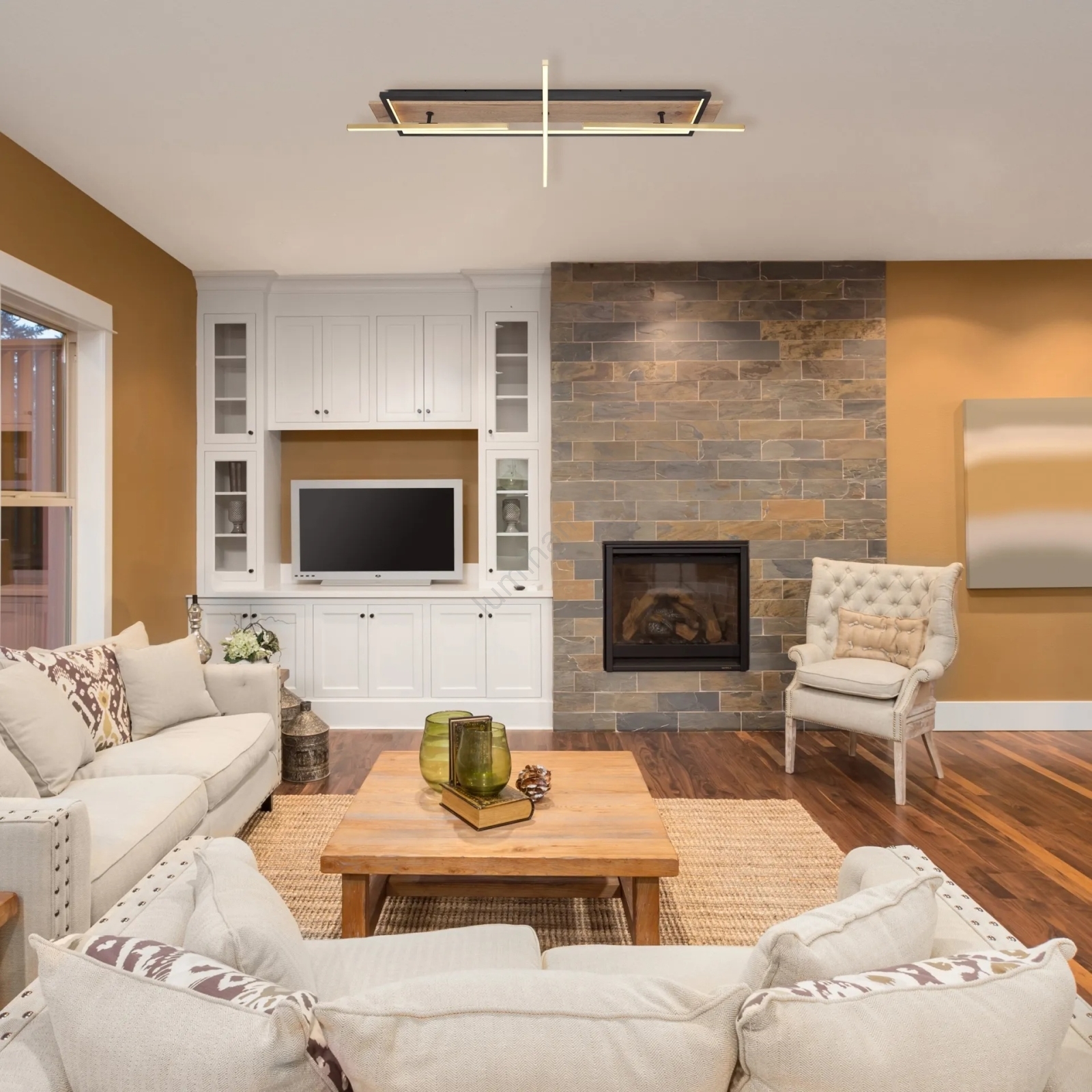 • Corp de tavan cu carcasă metalică mată, neagră, combinată cu detalii în tonuri închise din placă din fibră de lemn (MDF) și tije din aluminiu cu nuanță de alamă, care conferă încăperii un aspect rafinat și modern.
