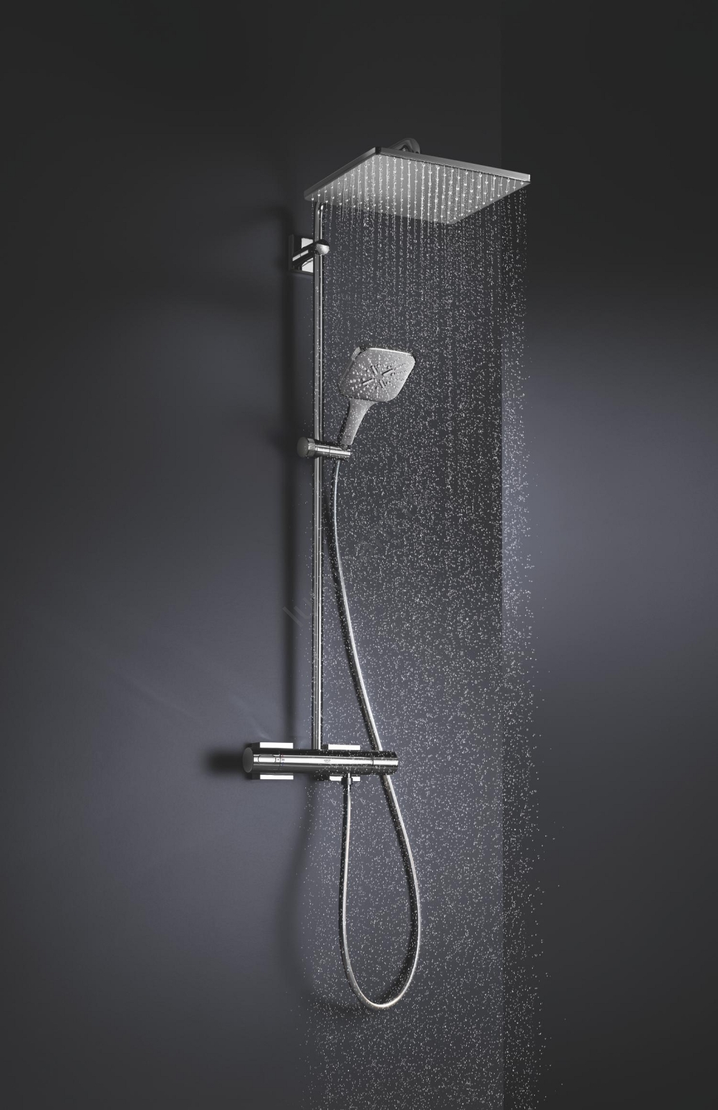• Baterie termostatată de perete cu funcția Aquadimmer pentru comutare ușoară între ieșiri.