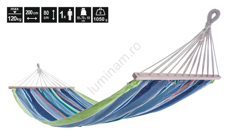 • Hamacul este conceput pentru o singură persoană și are dimensiunile 80 cm lățime, 200 cm lungime și o capacitate maximă de 120 kg.