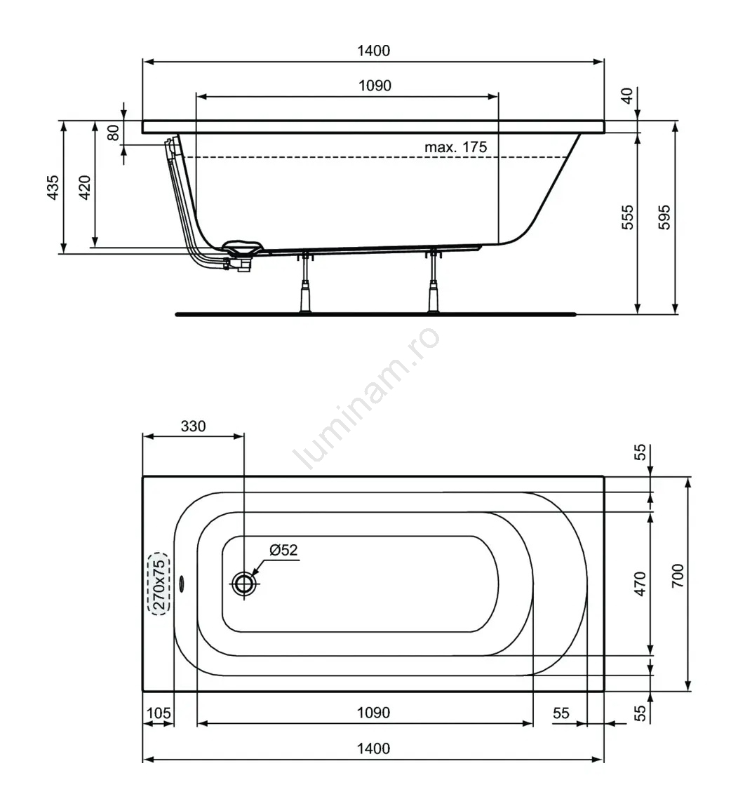 • Orificiul de scurgere are un diametru de 52 mm și este poziționat lateral.