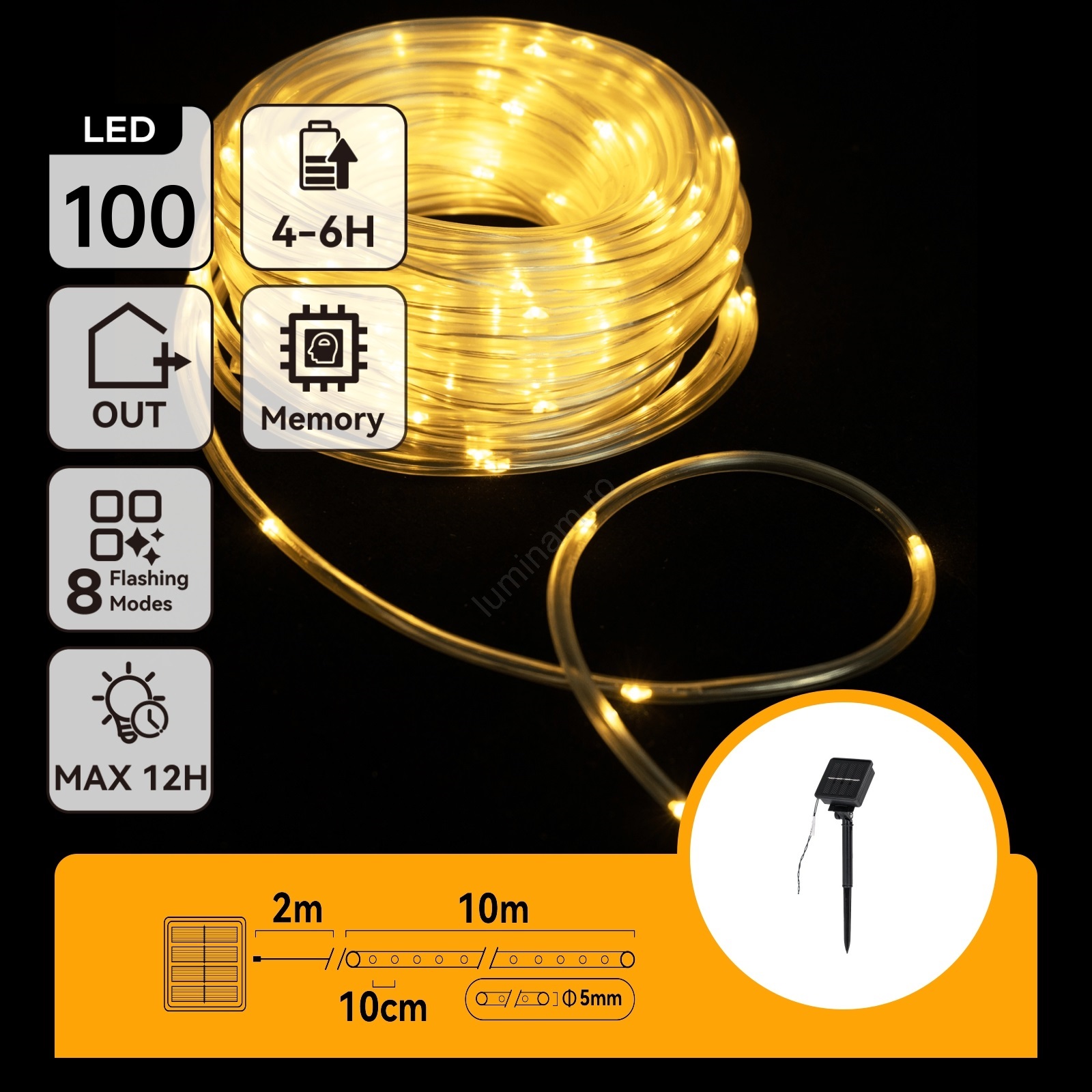 Aigostar - Ghirlandă solară cu LED, 100 LED, 8 funcții, 12 m, IP65, alb cald