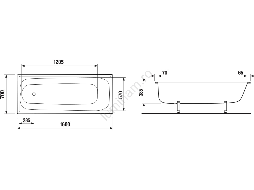 • Formă dreptunghiulară clasică cu dimensiunile: 1600 × 700 × 385 mm.