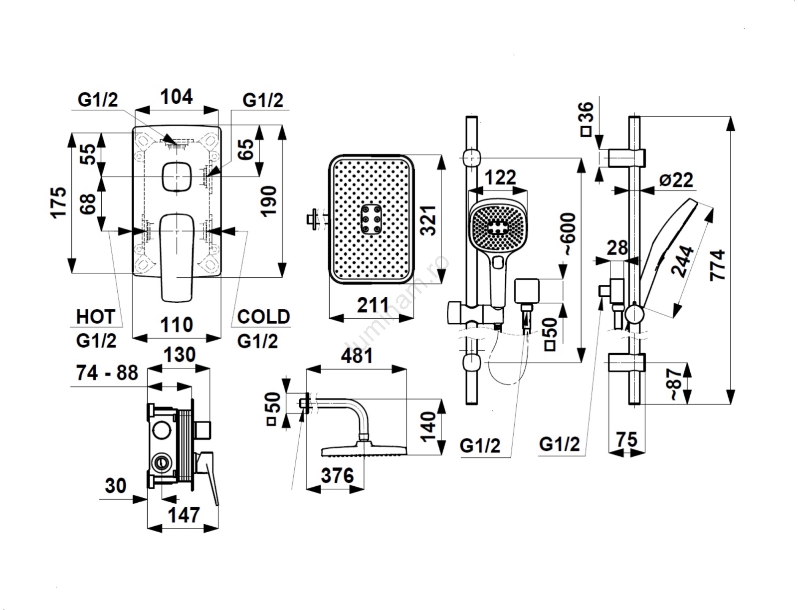 • Conținutul pachetului: cutie incastrată, baterie completă, braț de duș, cap de duș cu furtun, duș de mână cu bară glisantă ascunsă.