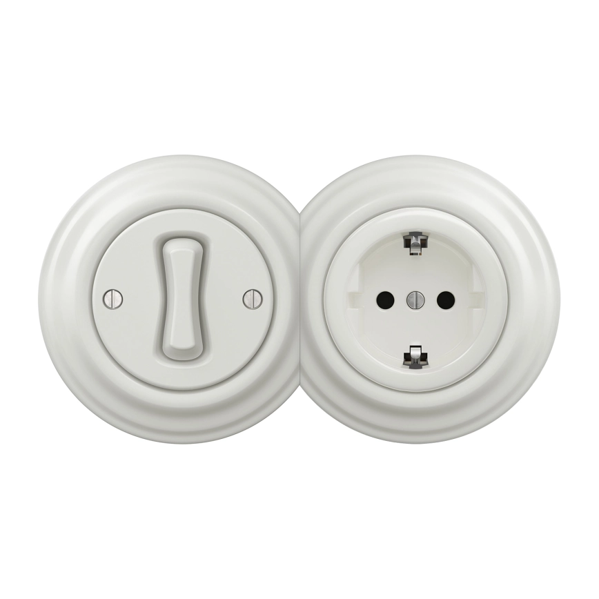 Kliklap - Întrerupător unipolar retro nr. 1 și priză SCHUKO 230 V cu ramă ceramică albă