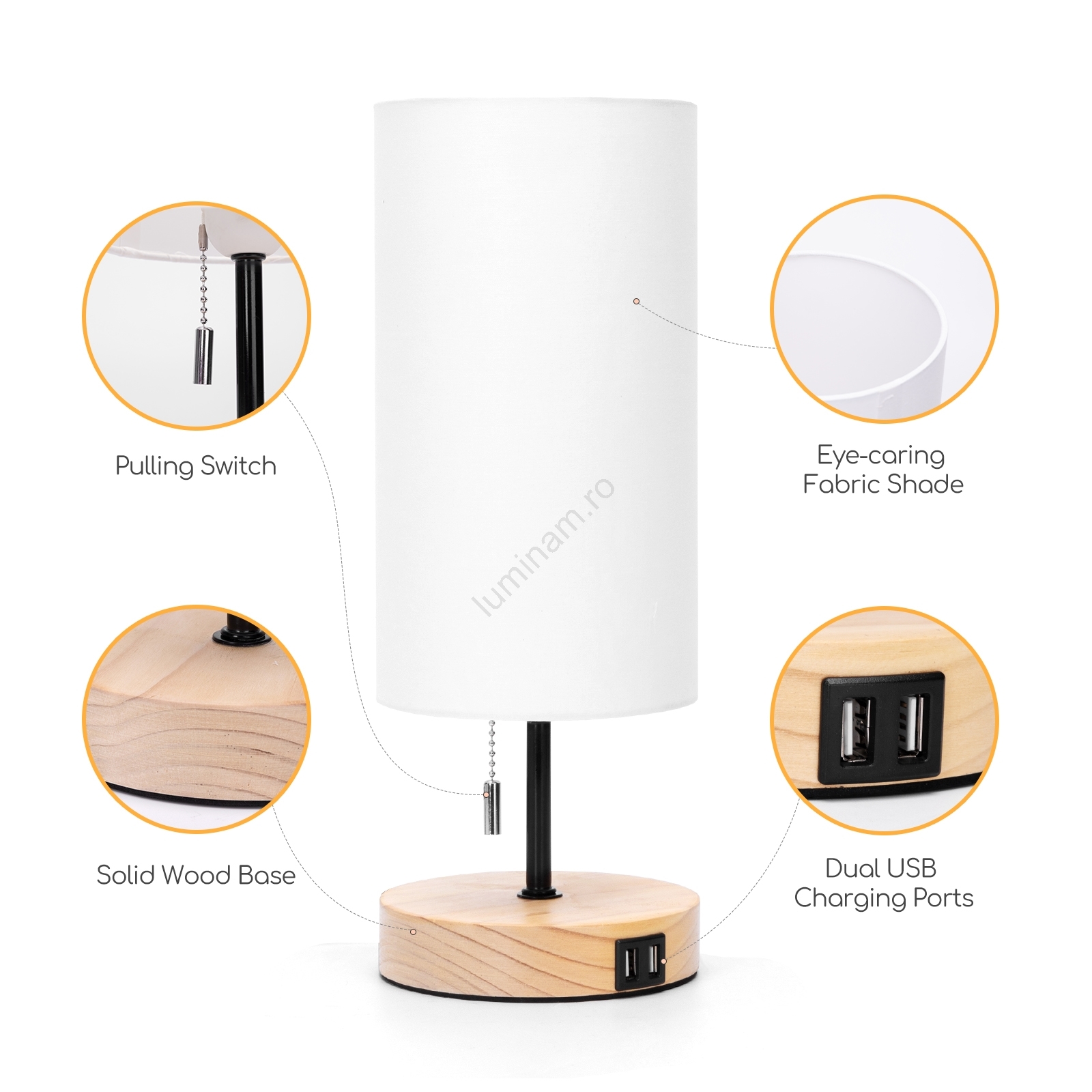 • 2 porturi USB integrate în baza lămpii pentru încărcarea telefonului mobil.
