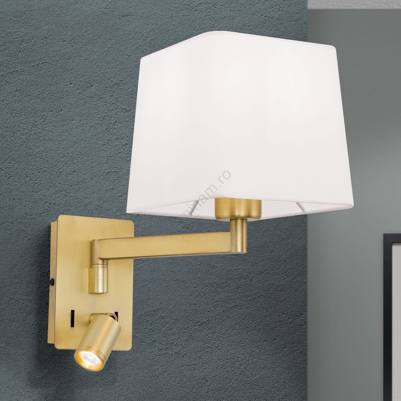 • Lampă de perete cu abajur din material textil (E27 - becul nu este inclus) și punct LED flexibil pentru citit.