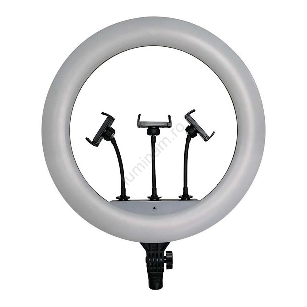 • Setul include lampa circulară, suportul pentru trepied, geanta din material textil, telecomanda pentru lampă, trei suporturi pentru telefon și adaptor de alimentare.