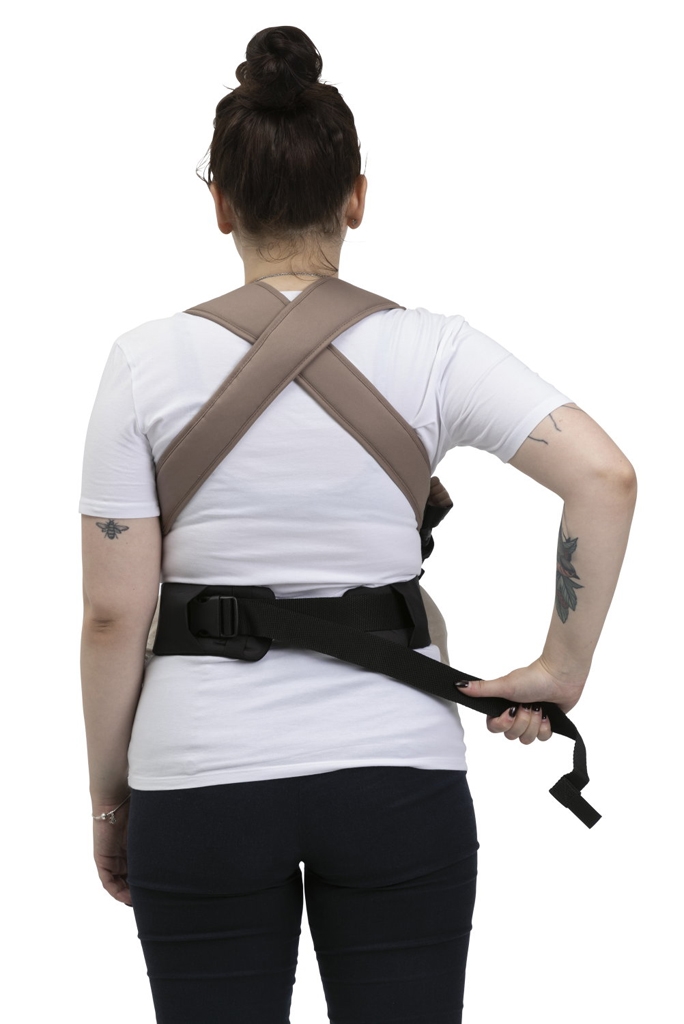 • Bretele căptușite pentru umeri, care se încrucișează pe spatele purtătorului și distribuie uniform greutatea copilului, și o centură lombară căptușită care preia corect greutatea.