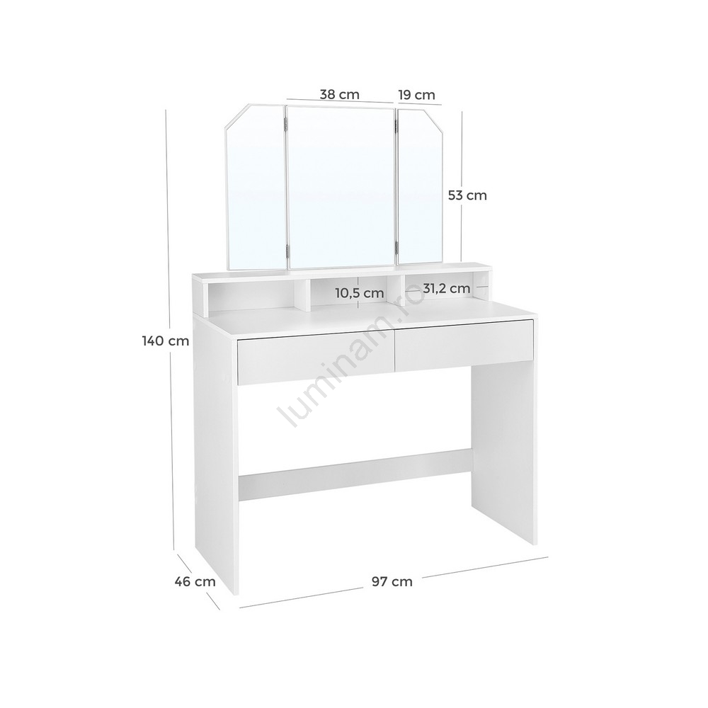 • 2 sertare și o poliță de deasupra păstrează cosmeticele și produsele de machiaj la îndemână.