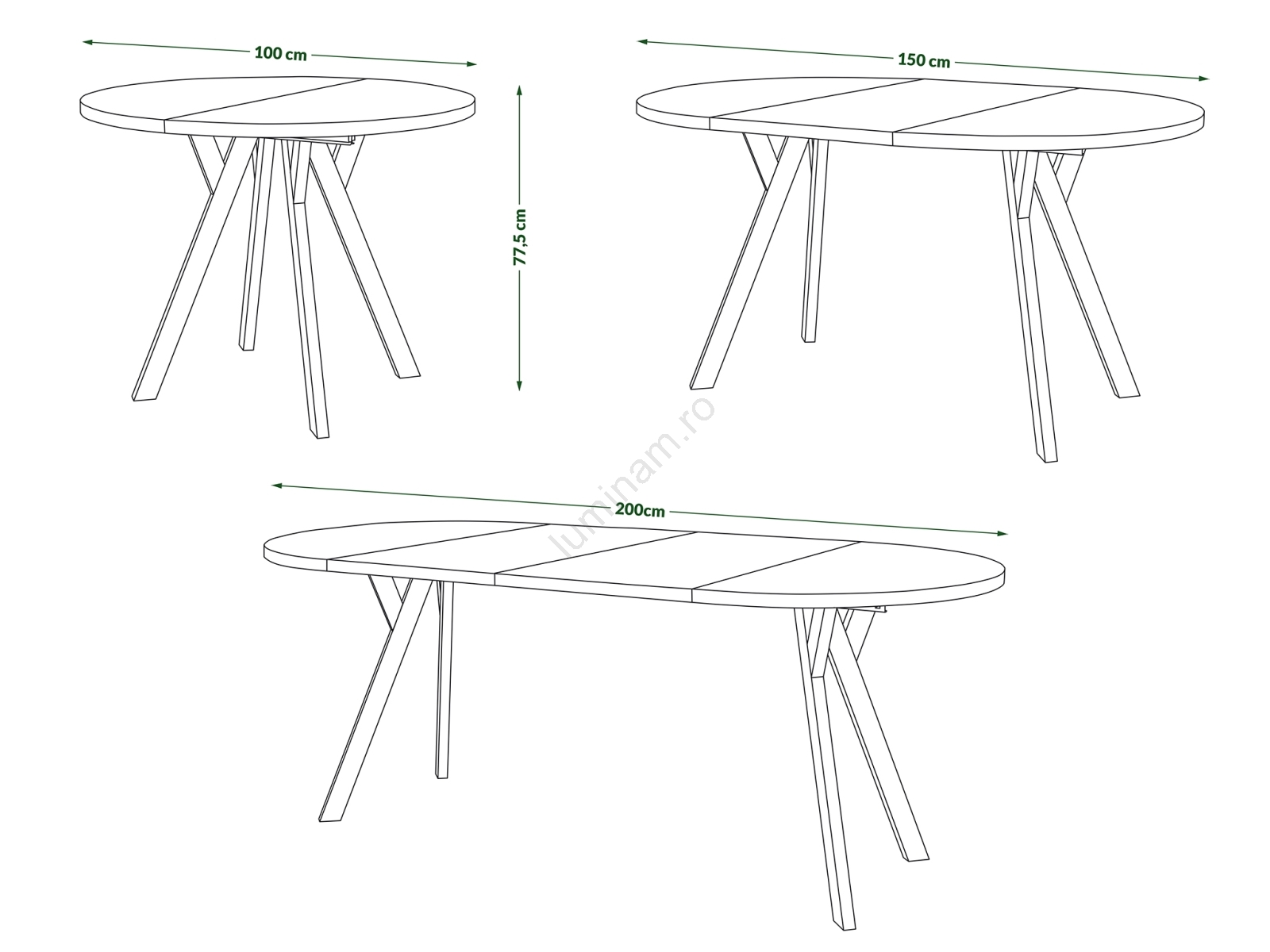 • Dimensiunile mesei după extindere: 200 x 100 cm și 150 x 100 cm.