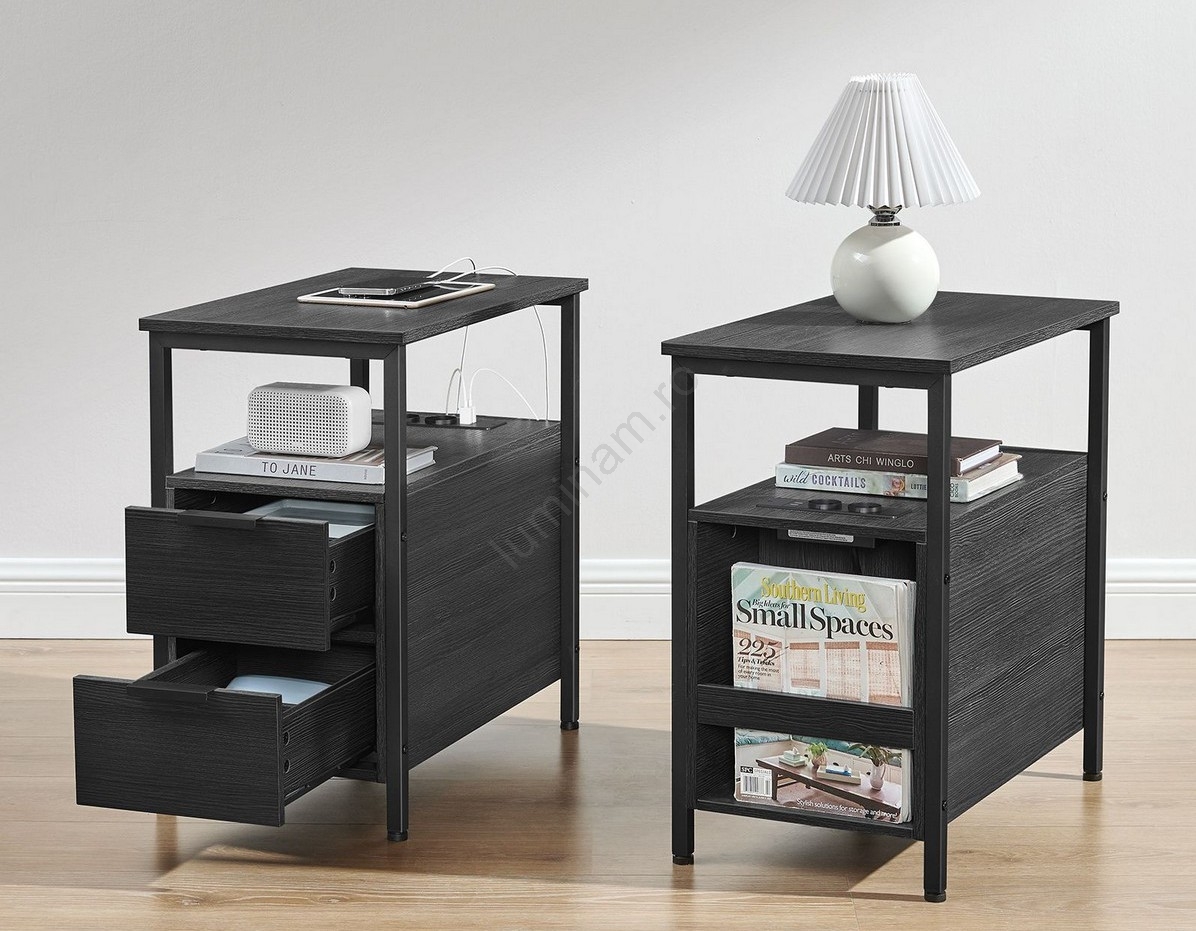 Masă laterală ROD, neagră, cu prize și porturi USB încorporate