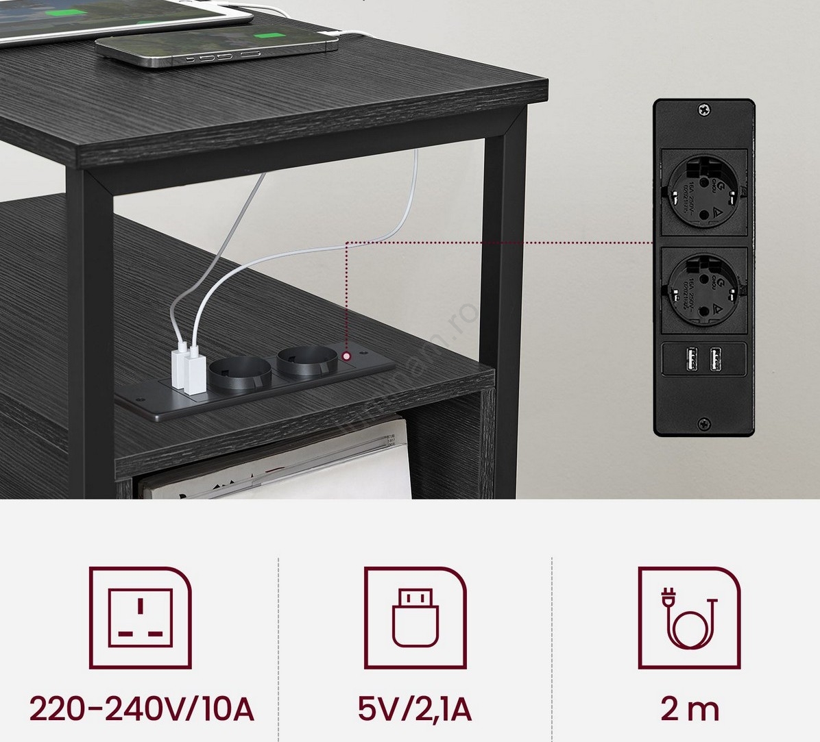• Masă laterală ROD, neagră, cu prize și porturi USB încorporate