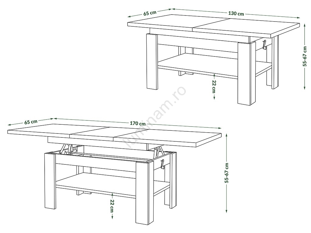 • Blatul poate fi ridicat până la 67 cm.