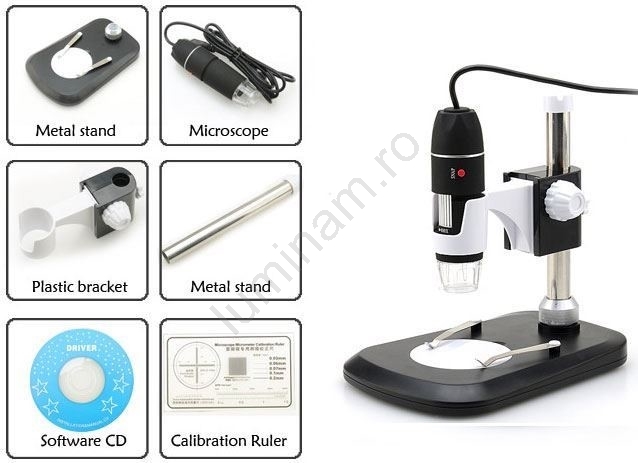 • Conținutul pachetului: 1 microscop cu cablu USB, 1 trepied, 1 card de calibrare, 1 CD cu controlere, manual și program microscop.