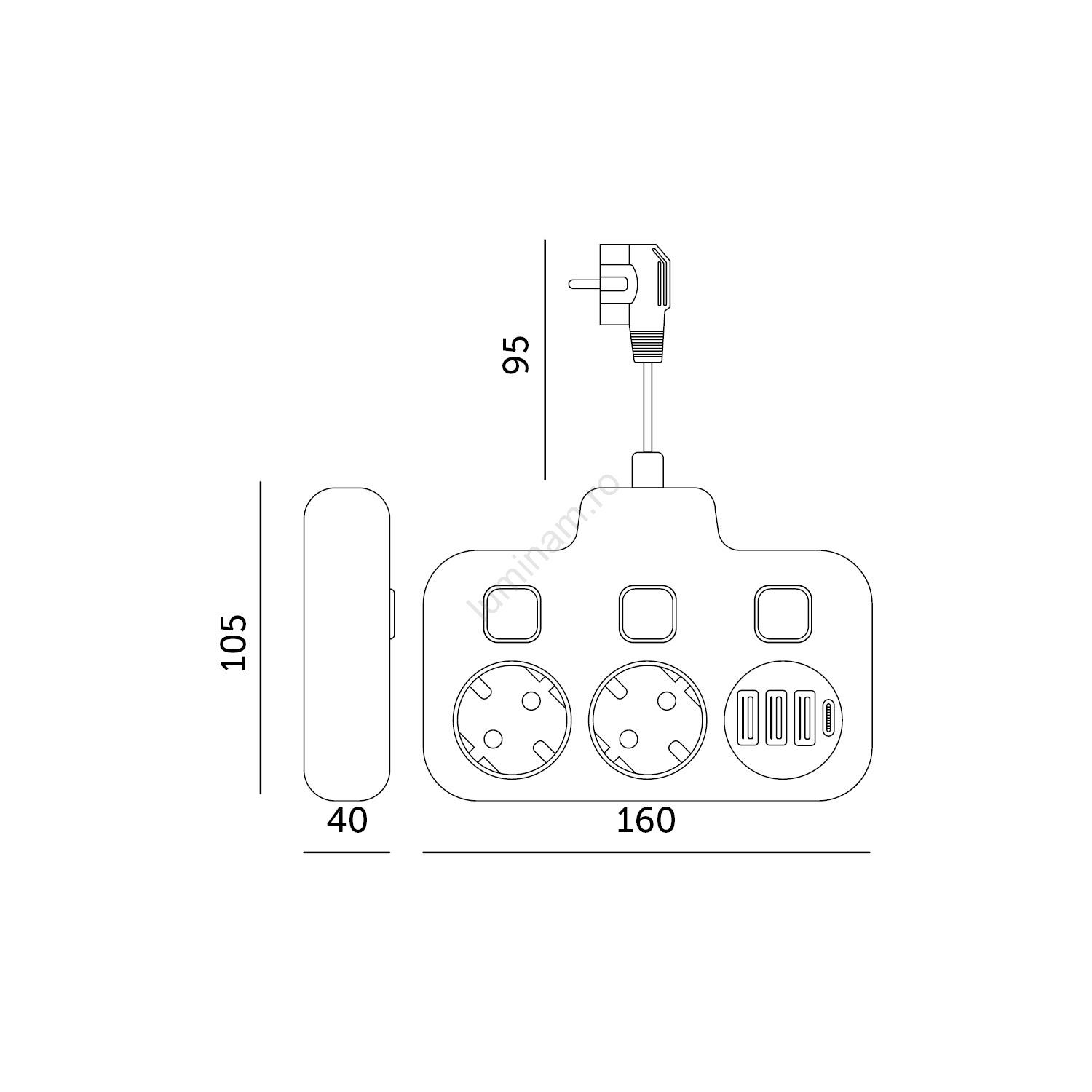 • Număr prize: 2 x 230V, 3 x USB-A și 1 x USB-C.