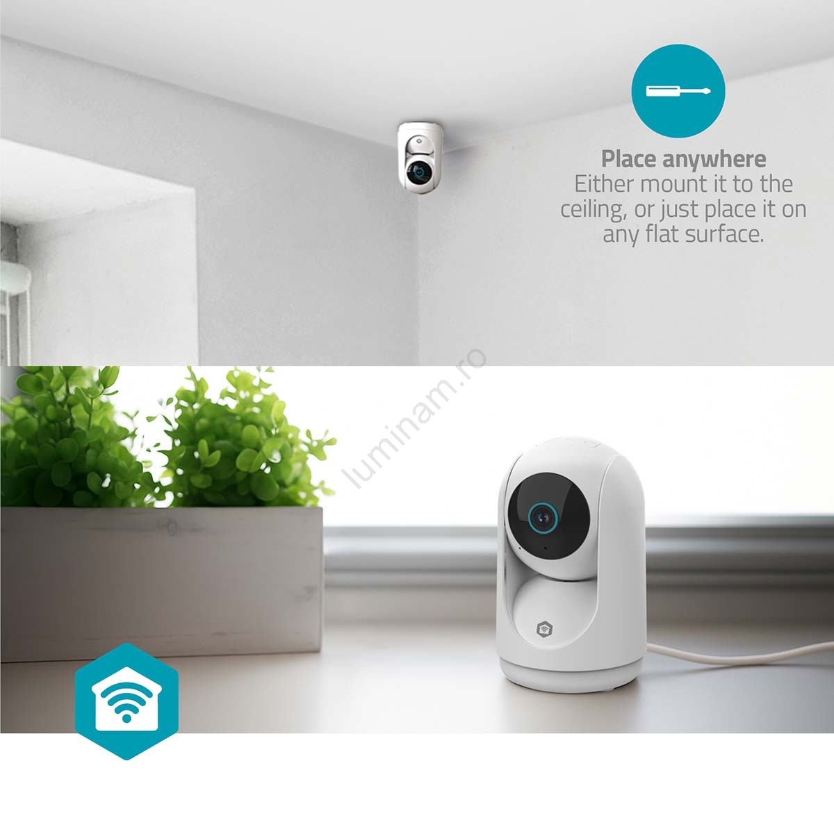 • Cameră de interior inteligentă compactă cu funcții avansate - soluția ideală pentru monitorizarea casei tale zi și noapte.