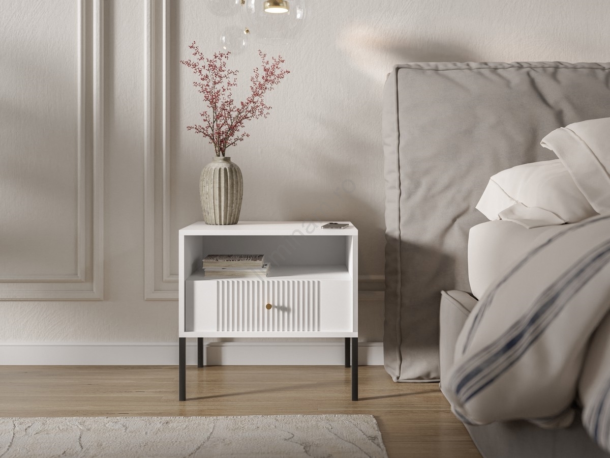 • Dispune de o poliță deschisă și un sertar decorat cu caneluri verticale pentru un efect vizual rafinat.