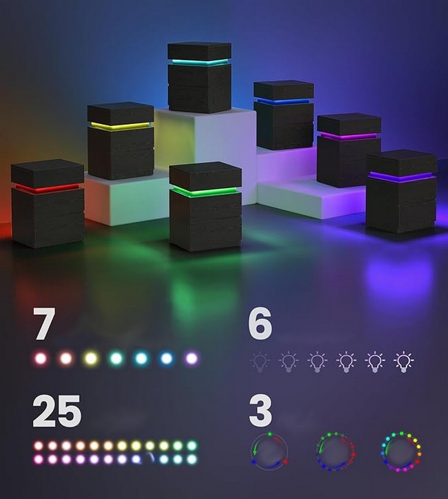 • Lumini LED în 25 de culori, 6 niveluri de luminozitate, 10 moduri și 6 frecvențe de clipire.