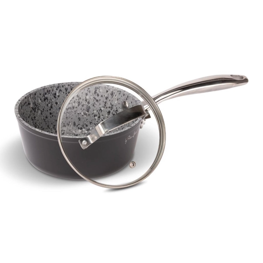 Oală mică din granit cu capac Lamart 16 cm negru/gri/oțel inoxidabil