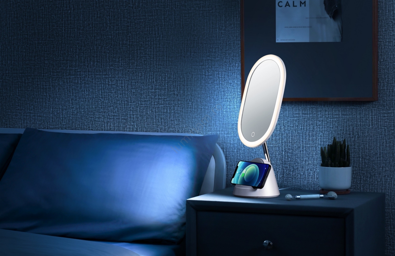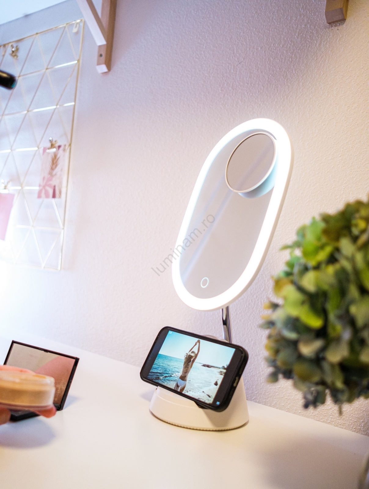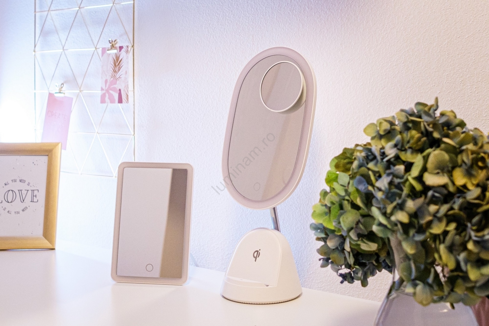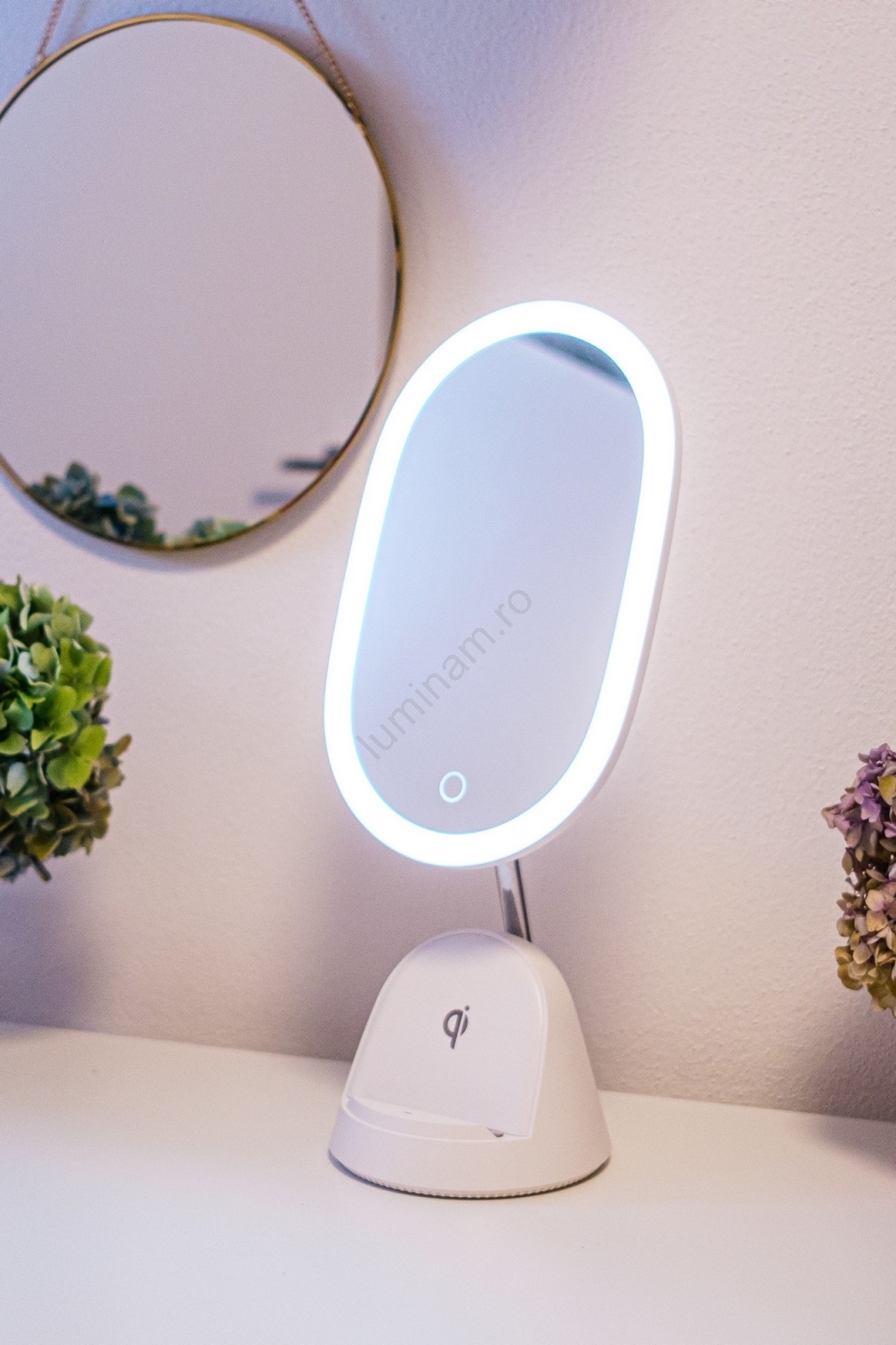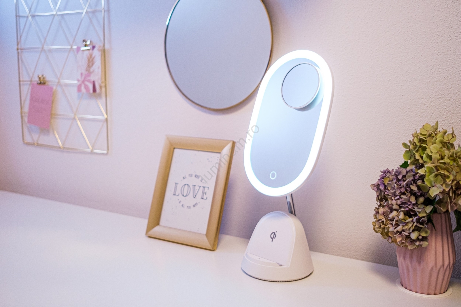 • Oglindă cosmetică reglabilă cu iluminare dimabilă și încărcare wireless Qi.