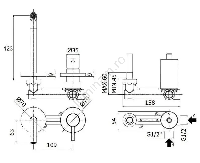 • Design cu două orificii, ideal pentru instalații moderne.