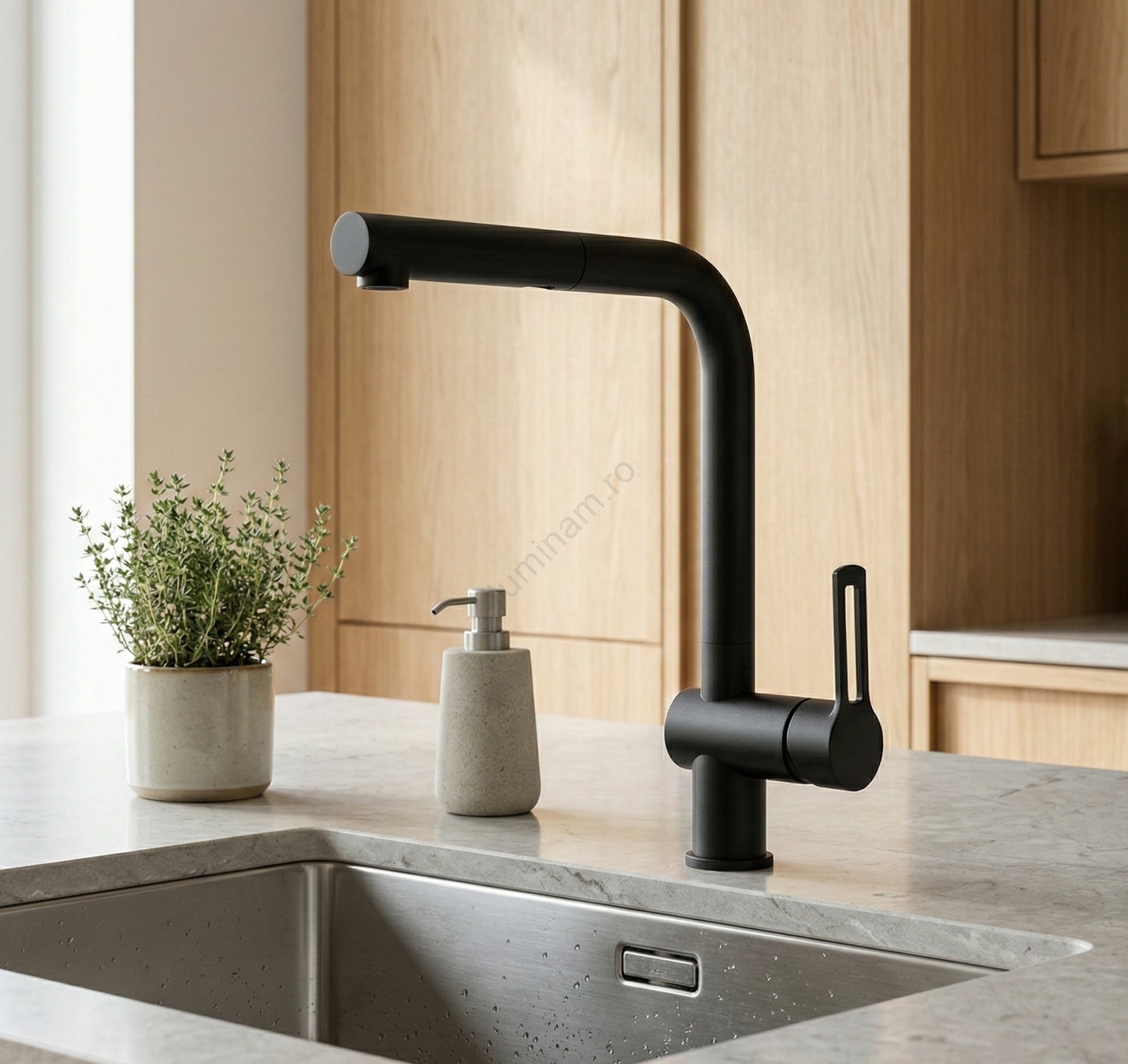 • Finisaj negru mat pentru un aspect modern al bucătăriei.