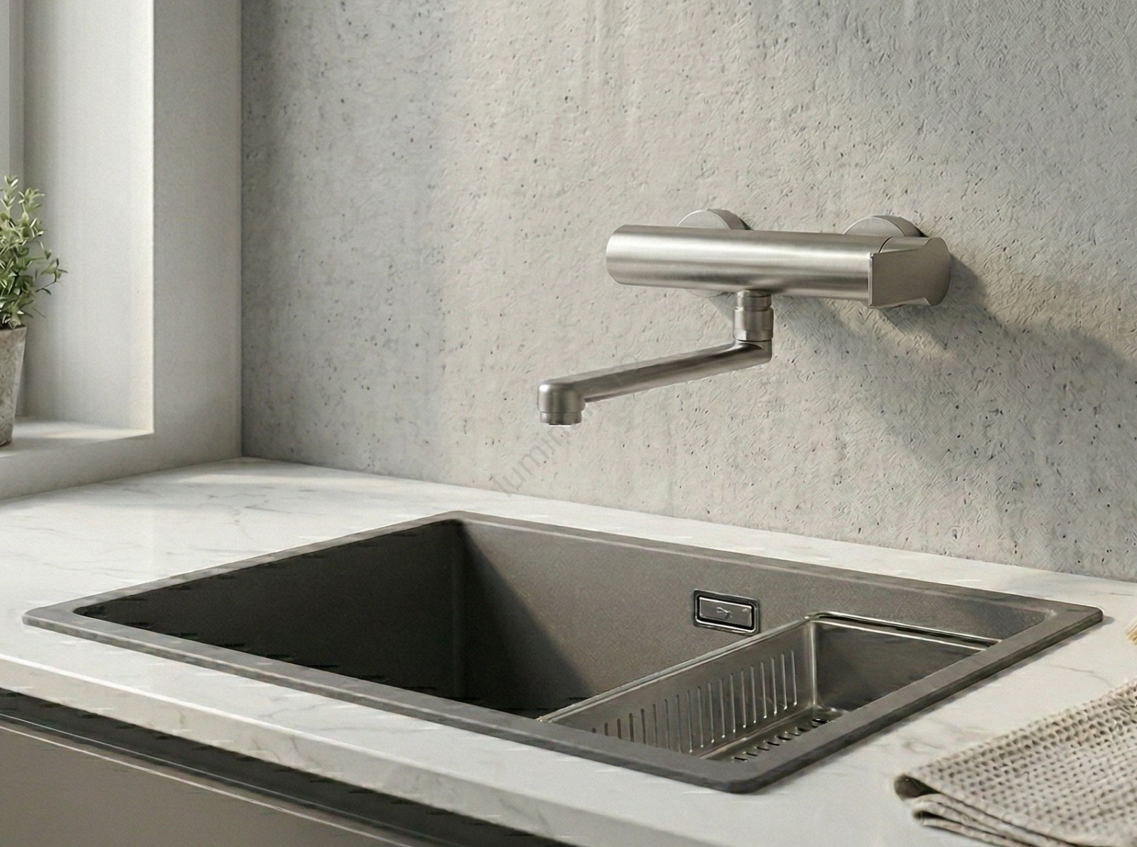 • Baterie de perete pentru bucătărie, din oțel inoxidabil.