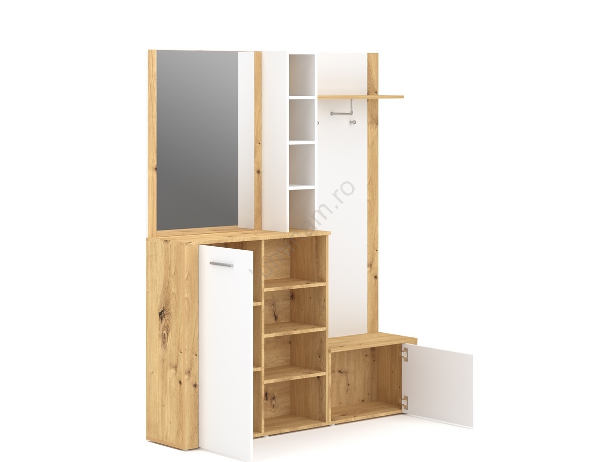 • Sub acesta se află mai multe compartimente închise și rafturi deschise pentru încălțăminte, accesorii sau alte obiecte de uz zilnic.