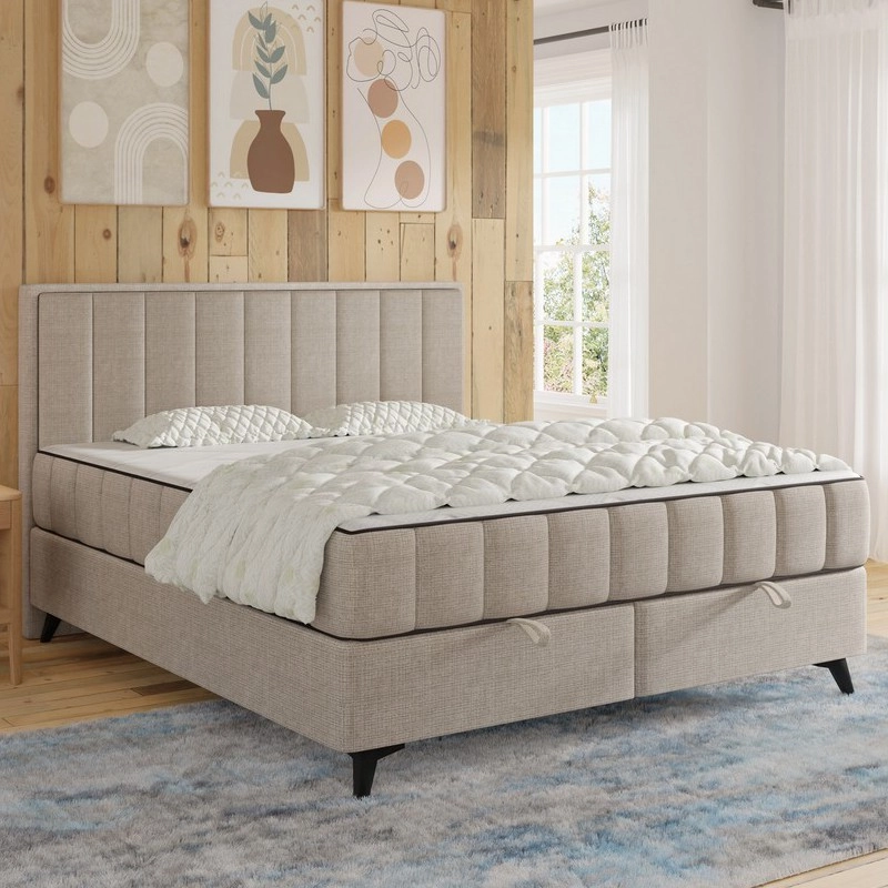 Pat tapițat ALICIA 140x200 cm, bej, cu saltele, topper și spațiu de depozitare
