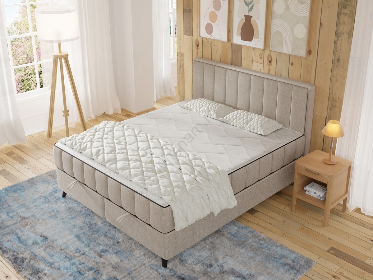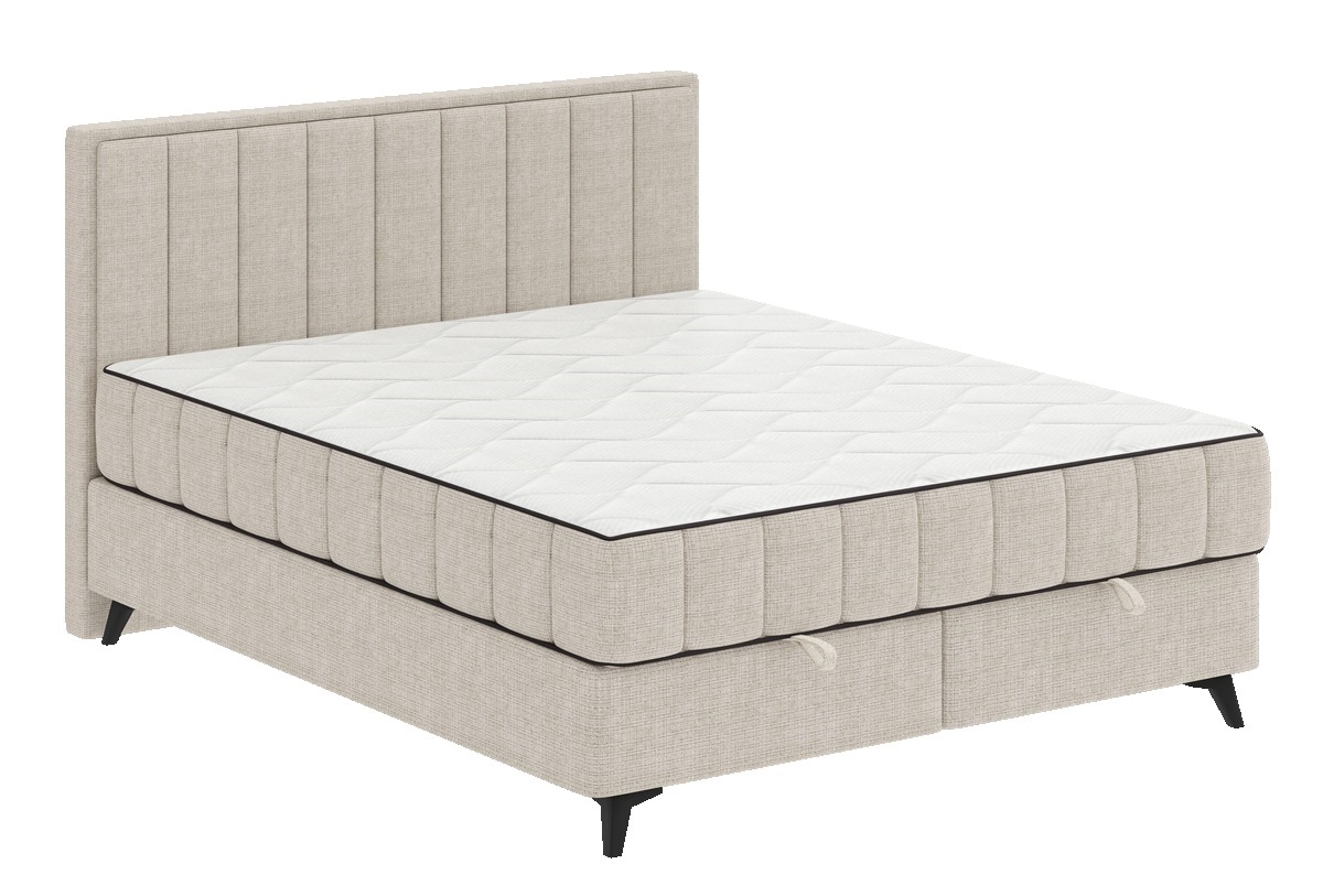 Pat tapițat ALICIA 180x200 cm, bej, cu saltele, topper și spațiu de depozitare