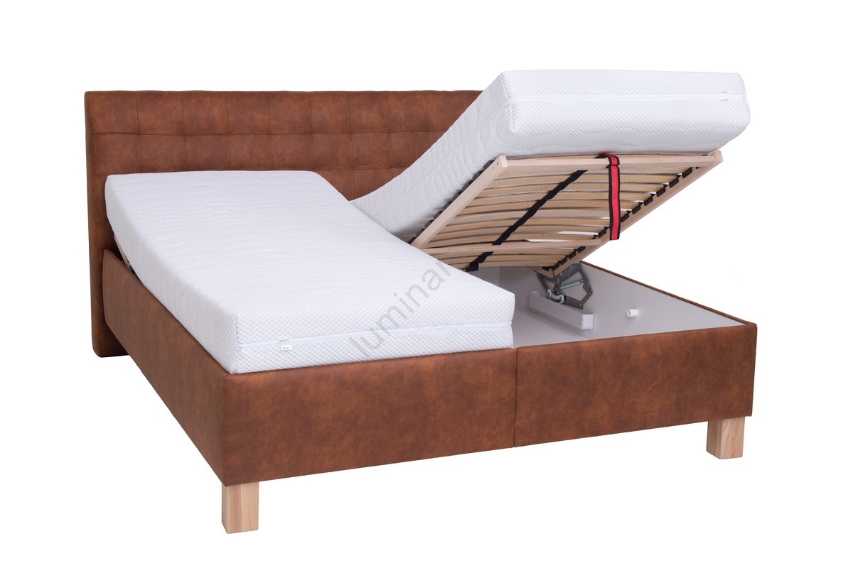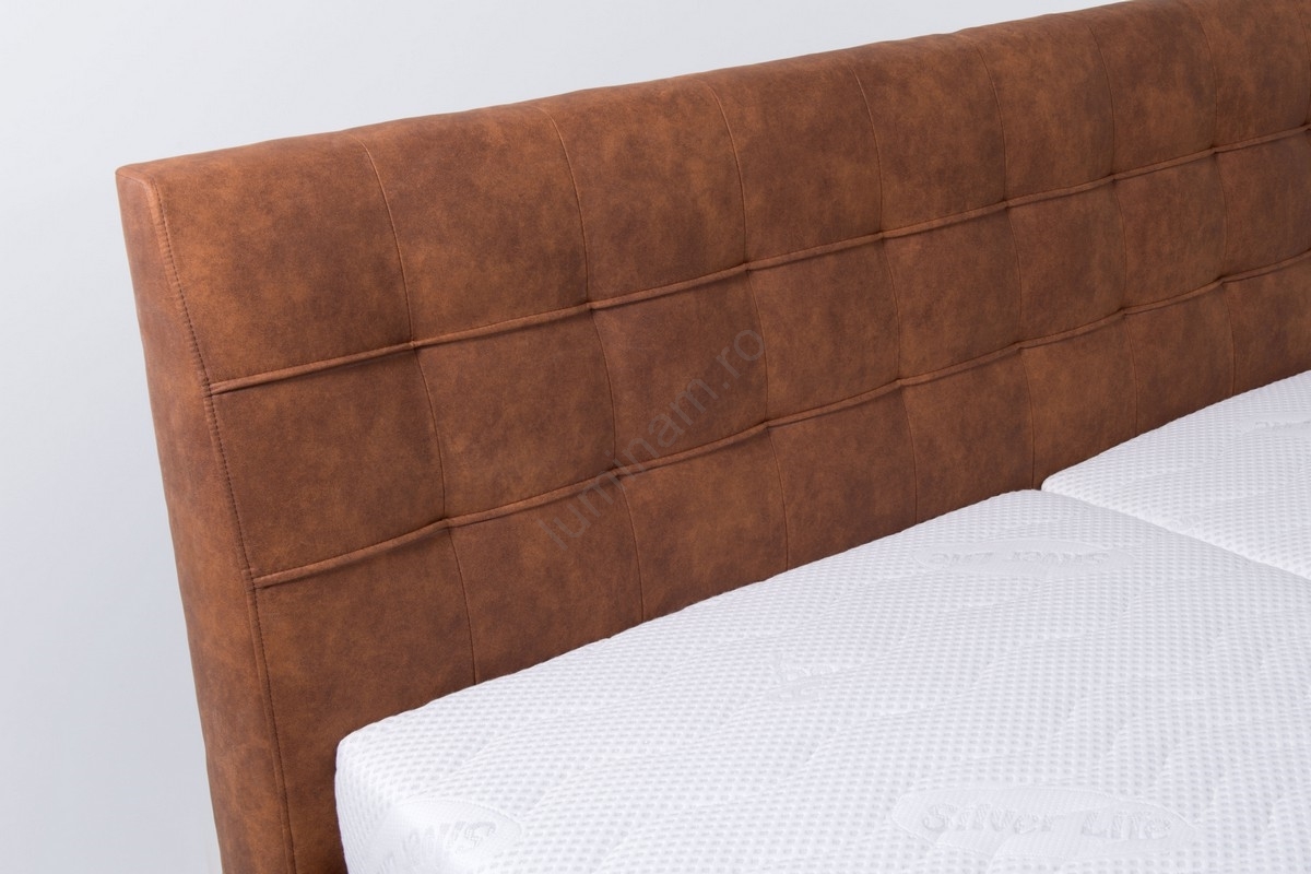 • Pat tapițat VIOLET 180x200 cm cu saltea și spațiu de depozitare, maro coniac