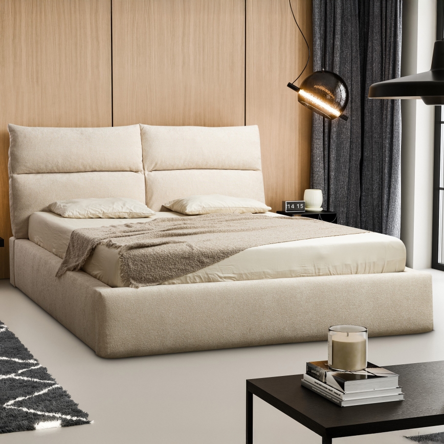 • Tapițeria patului are textură mini bouclé, cu detalii mici și interesante.