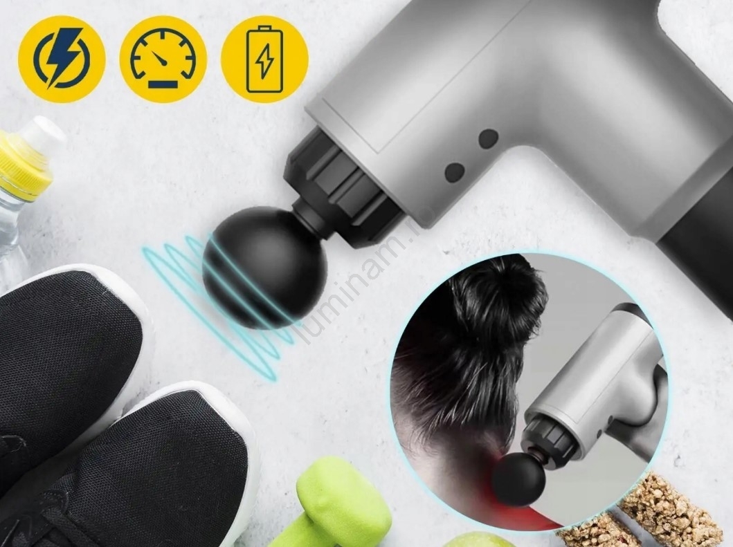 • Pistolul de masaj este silențios și, datorită sistemului inteligent de siguranță, se oprește automat după 10 minute de utilizare.
