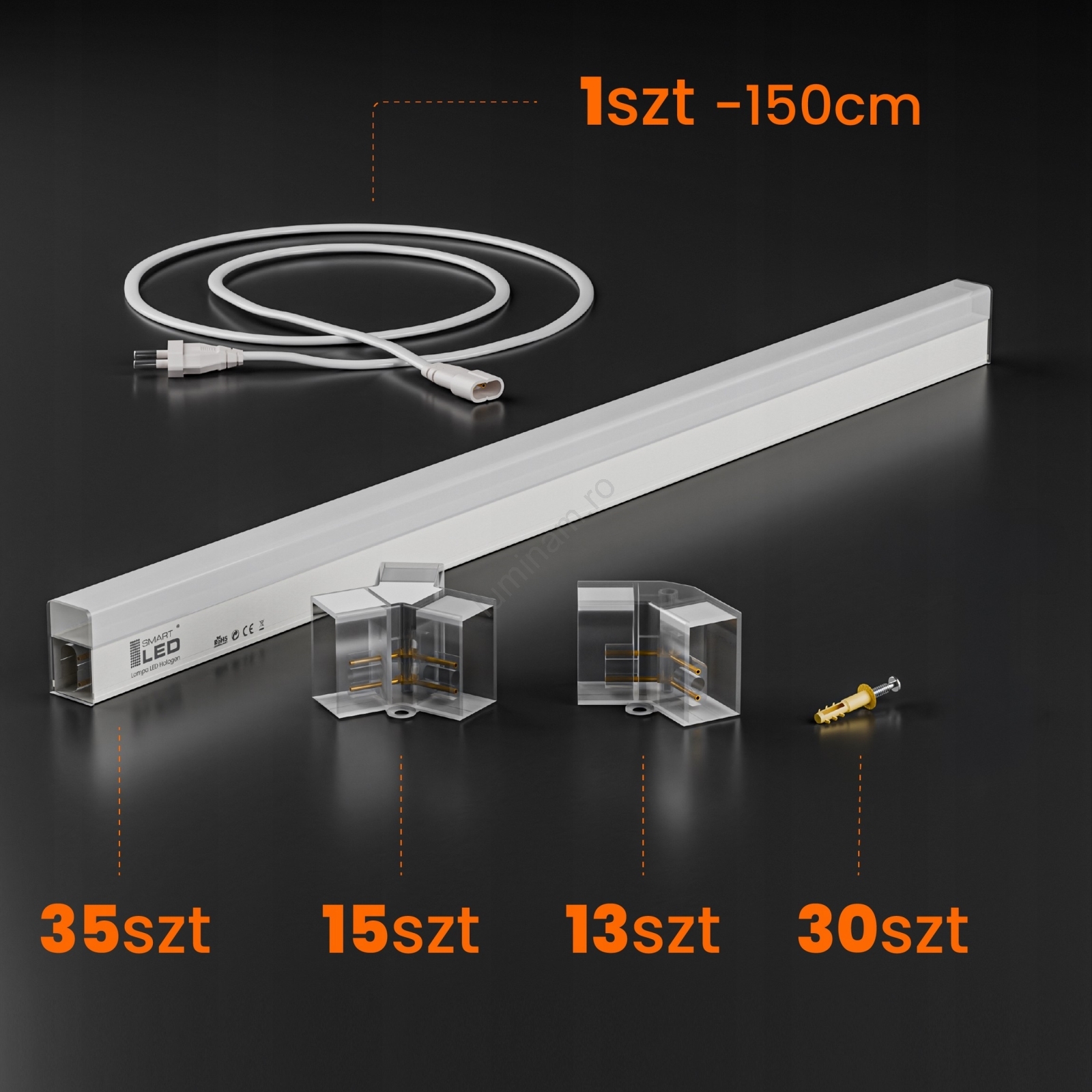 • Conținut pachet: cablu de alimentare (150 cm), 35 panouri LED, 15 conectori triple, 13 conectori unghiulari, 30 dibluri + șuruburi, accesorii de montaj (inele din plastic sau console metalice, la alegere).