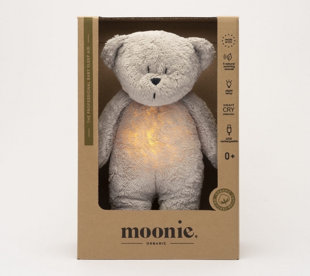 • Pluș de îmbrățișat cu sunete și lumină Moonie ursuleț 2.0 organic grey