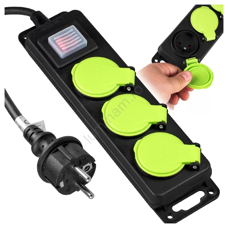 Prelungitor cu 3 prize și întrerupător, 5 m, IP44