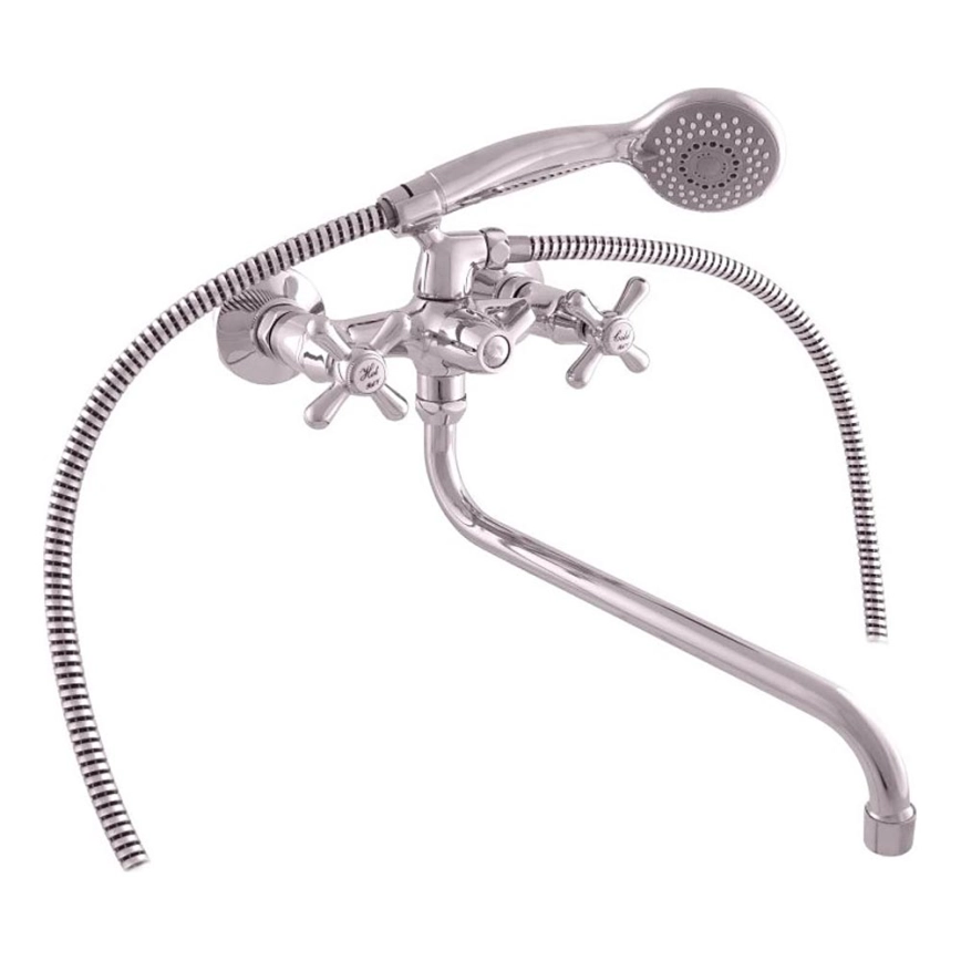 • Set pentru cadă cu baterie de cadă montată pe perete, comutator ceramic, braț rotund, duș și suport tip furcă pentru duș.