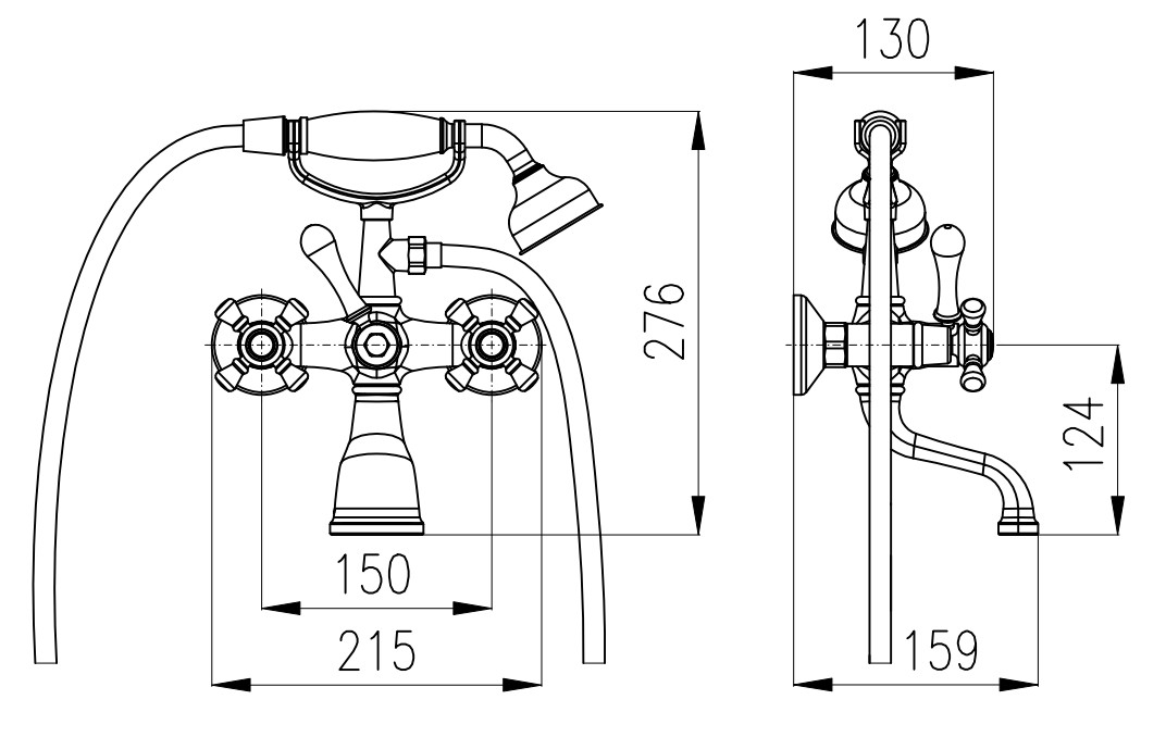 • Set pentru cadă cu baterie de cadă montată pe perete, prevăzută cu suport tip furcă pentru depozitarea dușului și duș inclus.