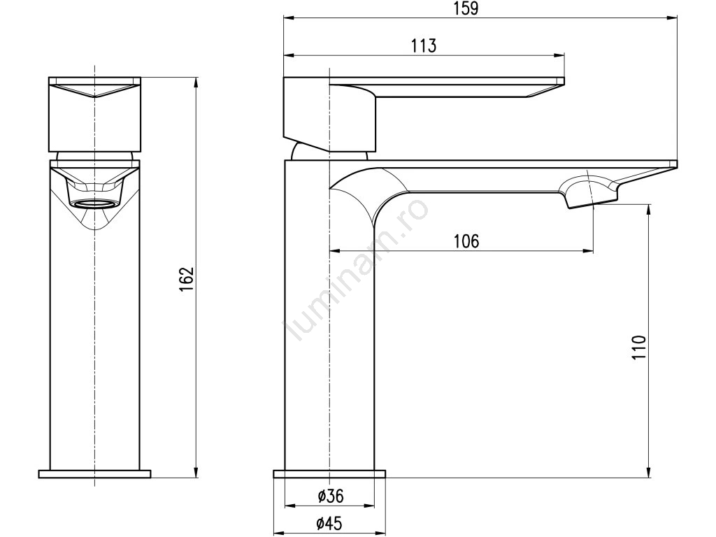 • Baterie de lavoar monocomandă montată, fără mecanism de evacuare (pop-up).