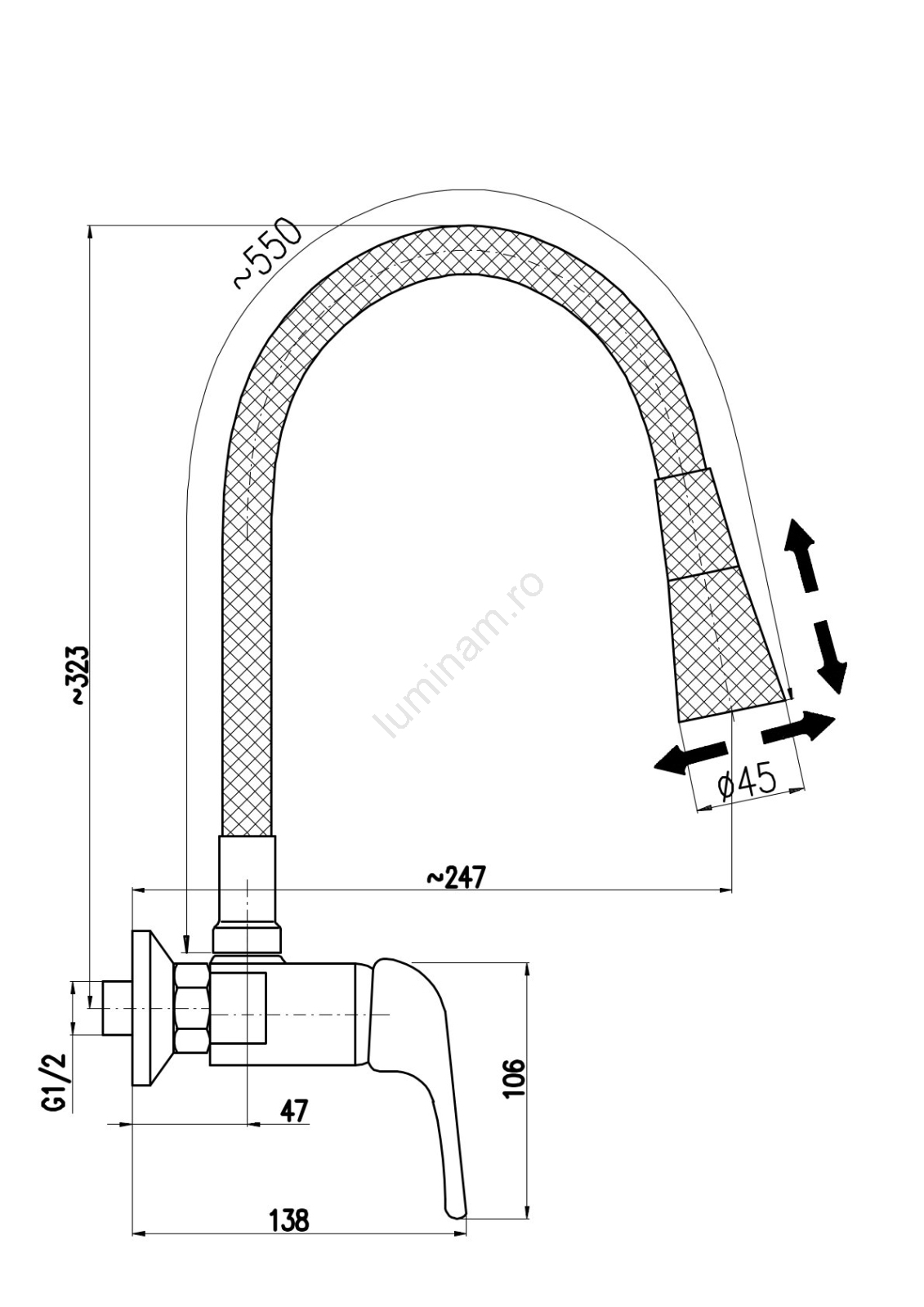 • Baterie de perete pentru chiuvetă, cu braț rotativ flexibil și duș extractibil.