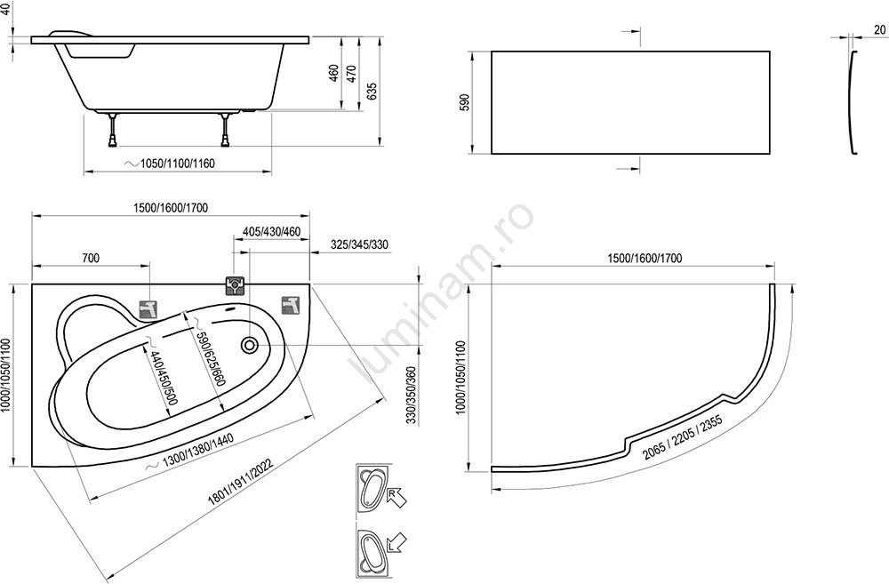 • Cada de colț Asymmetric, versiunea pentru partea stângă, este alegerea ideală pentru cei care caută confort și spațiu chiar și într-o baie mai mică.