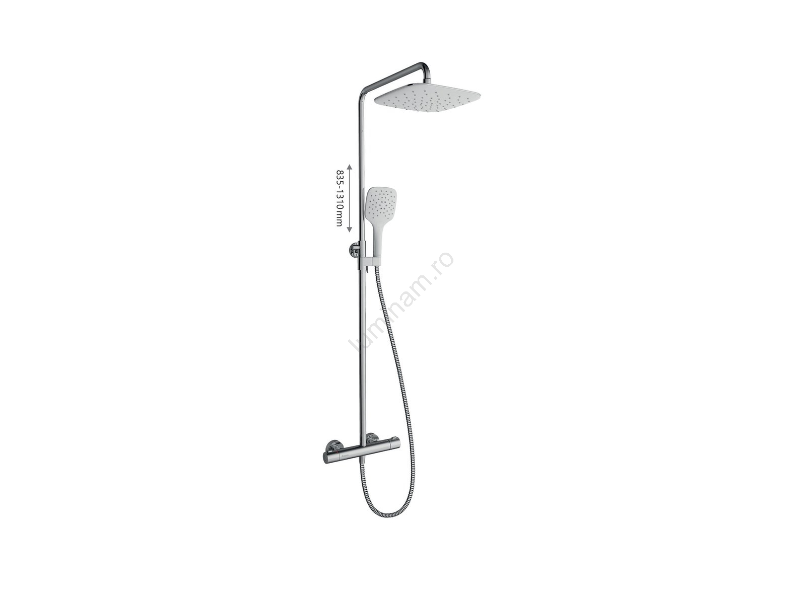 • Coloana de duș Termo este un set glisant cu baterie termostatică, finisaj crom lucios și cap de duș principal alb.