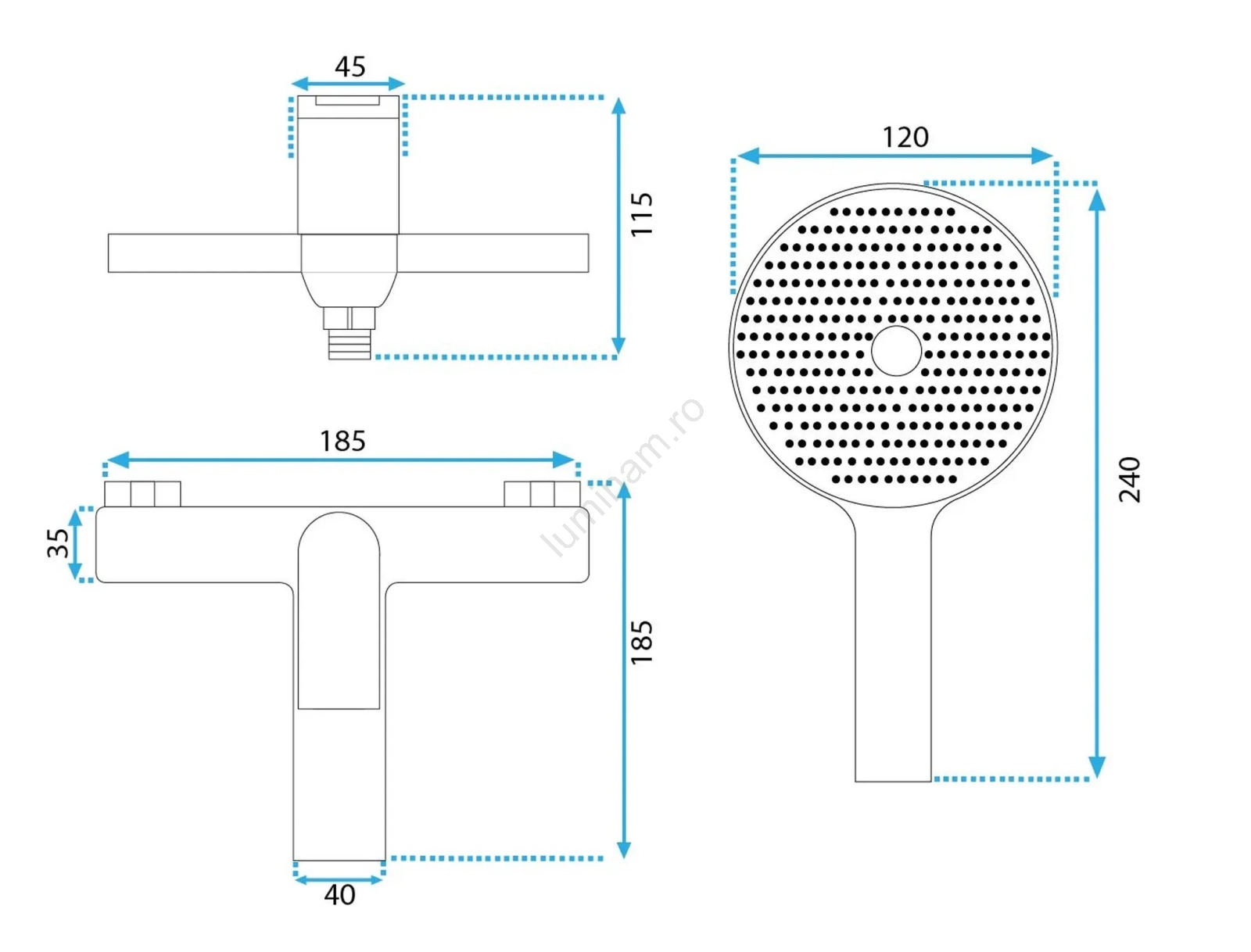 • Setul include: baterie de cadă, duș de mână, furtun de duș (120 mm), suport pentru dușul de mână.