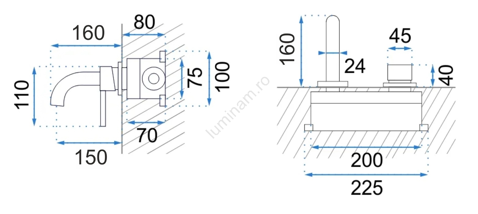 • Baterie de perete incastrată cu finisaj auriu elegant.