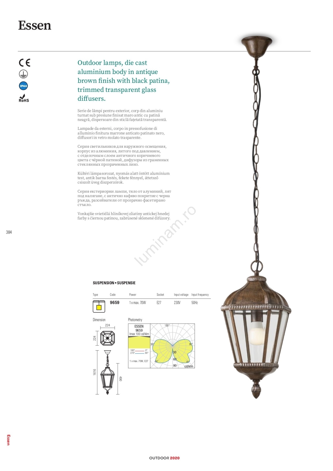 Articolul Redo 9656 - Lampă de perete pentru exterior ESSEN 1xE27/70W/230V IP44 maro/patină este caracterizat printr-un aspect plăcut și funcțional.  Produsul funcționează cu becuri cu soclu E27. De aici se pot cumpăra alte becuri la prețuri avantajoase.