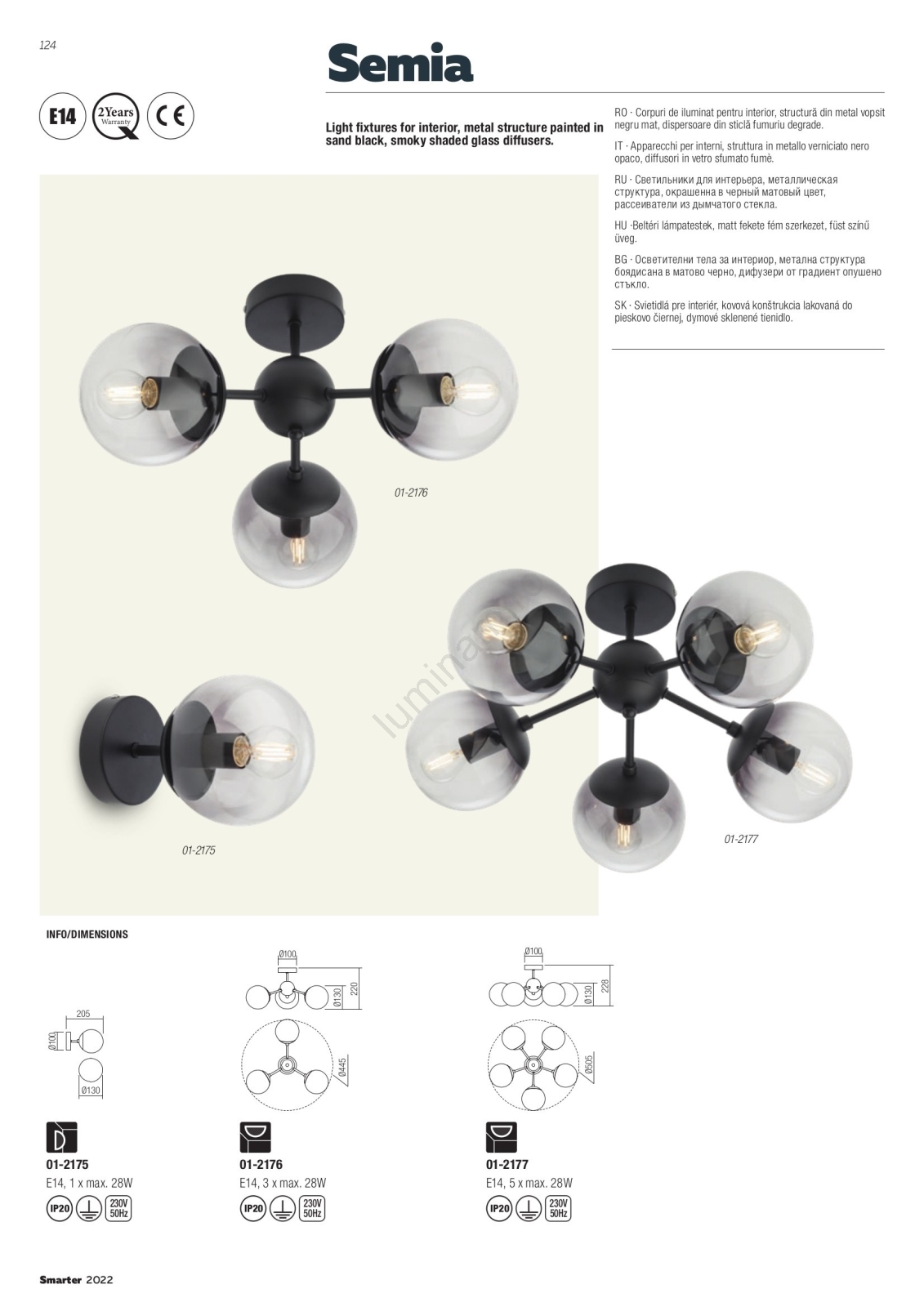 Articolul Redo SEMIA 01-2176 - Lustru cu tijă, 3xE14/28W/230V, negru/fumuriu este caracterizat printr-un aspect plăcut și funcțional.  Produsul funcționează cu becuri cu soclu E14. De aici se pot cumpăra alte becuri la prețuri avantajoase.