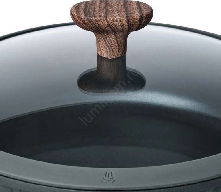 • În pachet este inclus un capac din sticlă rezistent, cu margine din silicon și orificiu pentru evacuarea aburului, care păstrează eficient căldura în interior și permite monitorizarea procesului de gătire.